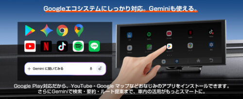 また、Androidシステム内蔵なので単体でも動画やアプリが使えて、ナビと動画の同時表示ができるのは嬉しいポイントです。